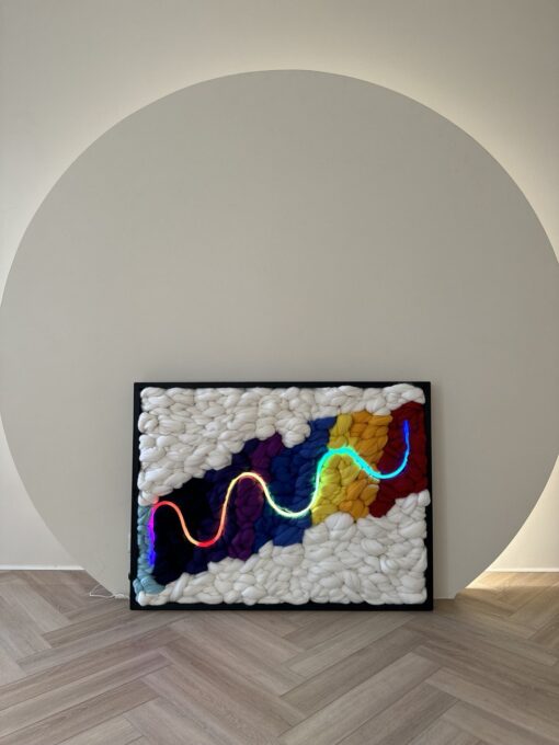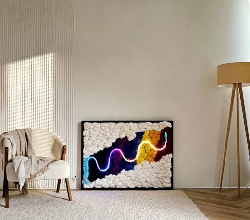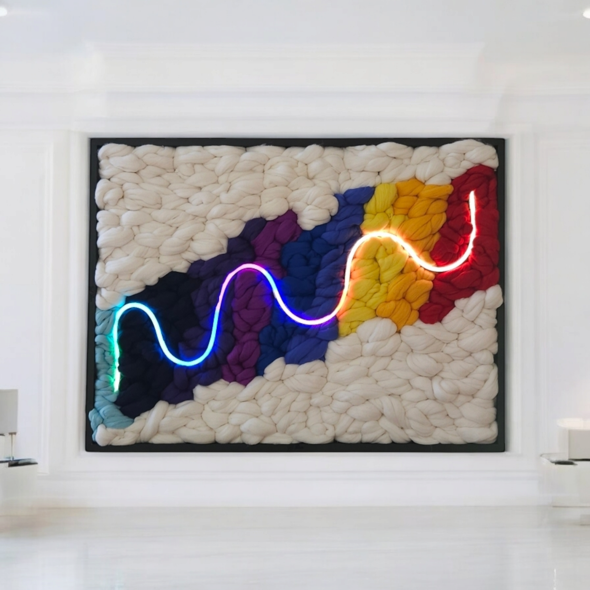 This exquisite artwork, crafted from extrafine Australian Merino wool, embodies the perfect fusion of craftsmanship and innovation. Set against a pure white background, the piece is brought to life with vibrant, joyful colors that radiate energy and evoke a sense of positivity. The inclusion of LED lighting elevates the experience, with the ability to synchronize the colors to music and the surrounding atmosphere, creating a dynamic visual experience that enhances the mood. The artwork is elegantly framed in Polish oak, adding a touch of timeless sophistication.